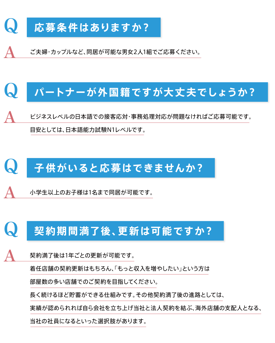 支配人職経験・夢を叶える資金・人を育てる力まで。目標に向かう二人が、多くを得られる全く新しい支配人制度です。