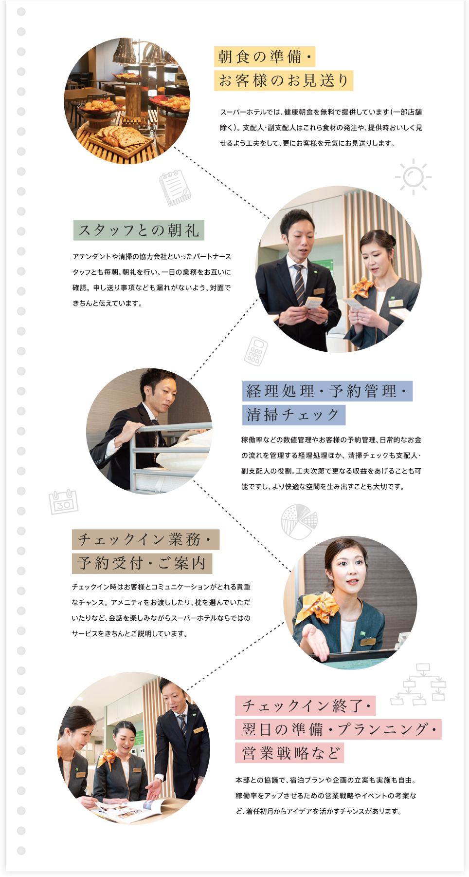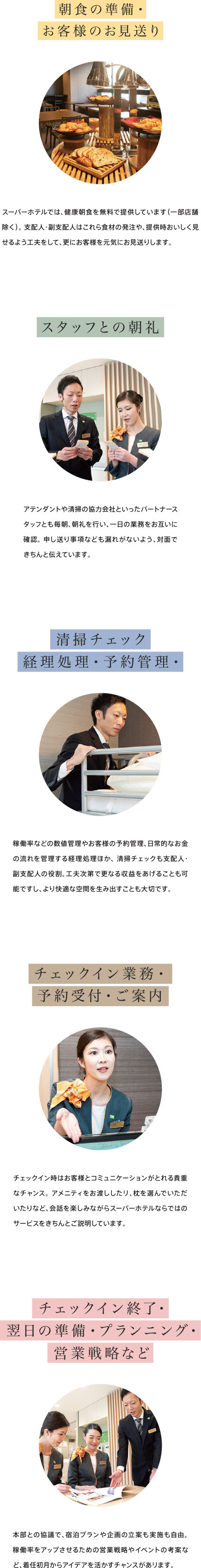また、各人のライフプランや体調に合わせたフレキシブルな人員配置を大きな視点から行うこともできます。これからは統括支配人という役割がスーパーホテルにとって不可欠になっていくのではないでしょうか。