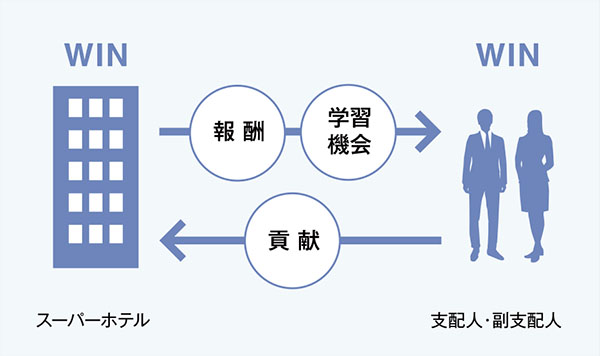 スーパーホテルのベンチャー支配人は、4年間という契約期間を設け、一棟丸ごとお任せしたホテルで、経営者としてマネジメントを実践していただきます。ベンチャー支配人は開業資金と経営ノウハウを、当社はビジネスヘの戦力を得られるのがこの制度の特徴。つまりベンチャー支配人制度は、双方がメリットを得られるWIN-WINの関係によって成リ立っているのです。