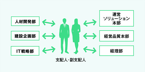スーパーホテルのベンチャー支配人制度は、支配人・副支配人をサポートする社内体制を整えています。「運営ソリューション本部」「経営品質本部」「IT戦略室」「建設企画部」など、スーパーホテル本部の6つの部署が、店舗運営をバックアップ。お客様満足と安定した経営を実現するお手伝いをしています。明確な課題解決からささいな不安まで、気軽に相談できる体制を完備しているのです。